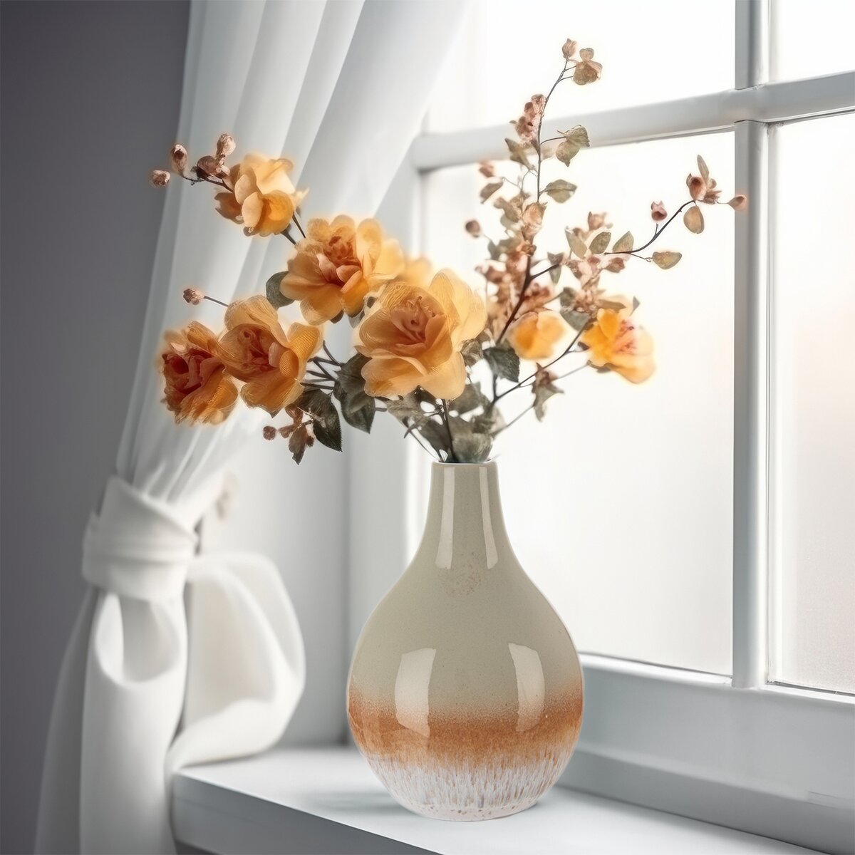 Oblá kameninová žíhaná váza s užším hrdlem bude ozdobou interiéru. Zvlášť v dnešní době se styl 70. let často objevuje v designu a kouscích, které oživí každou domácnost.
