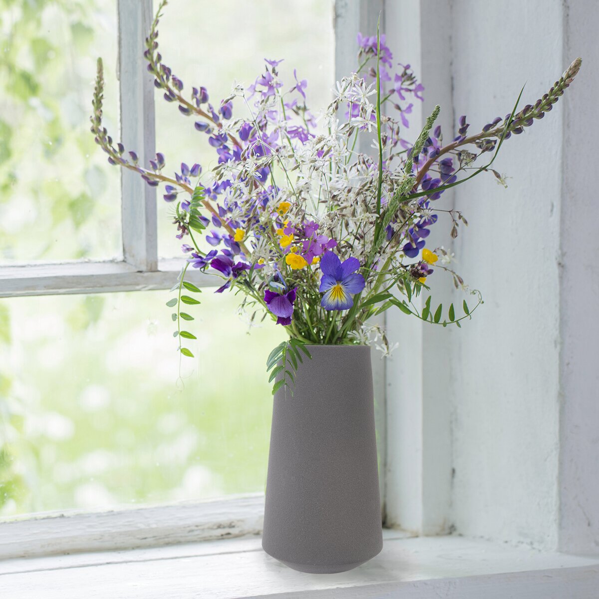 Kód produktu 820188Šedá porcelánová váza s hrubou strukturou má výšku 24 cm a je vhodná na řezané i suché květiny nebo dekorativní traviny a větvičky.