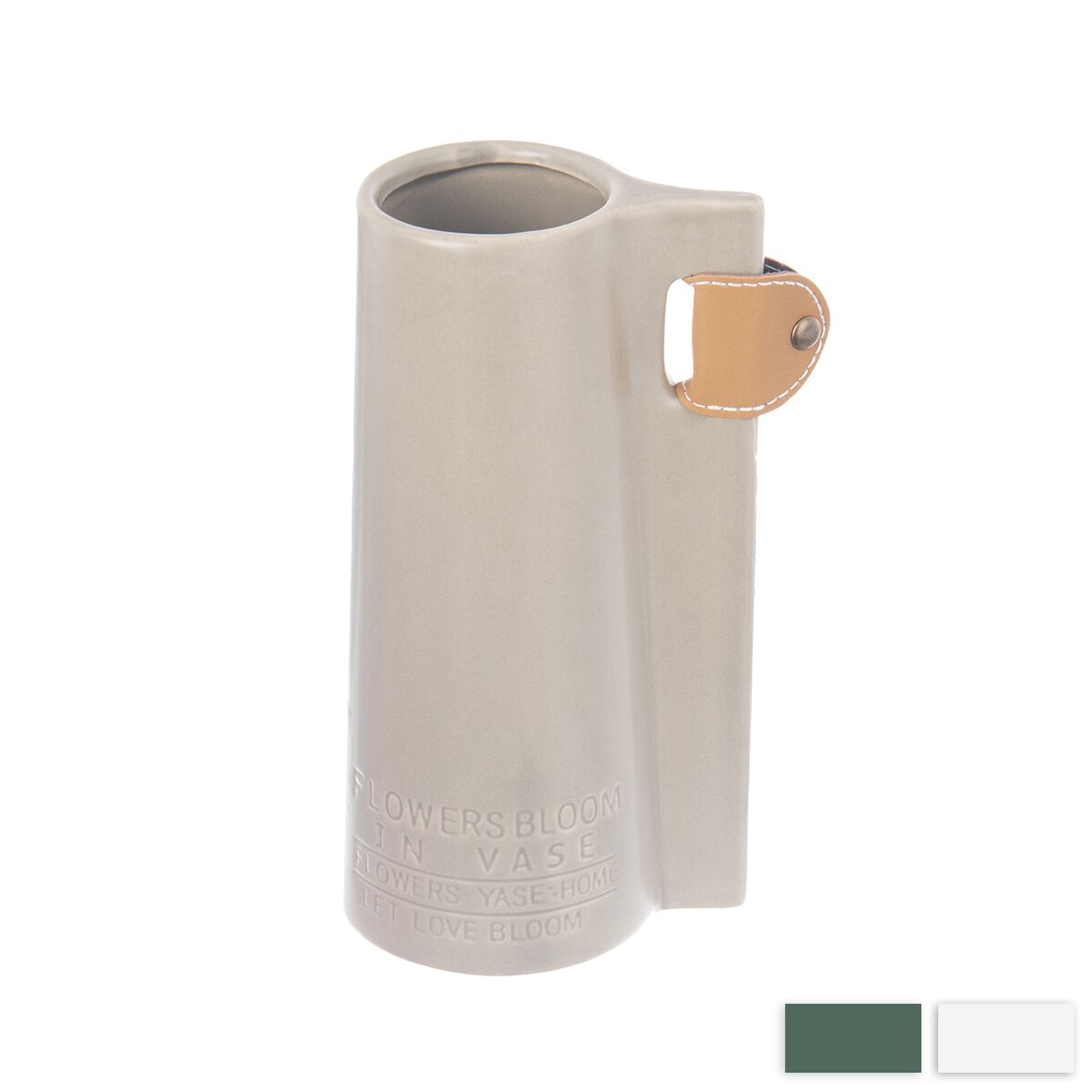 Kód produktu 820176Menší glazovaná keramická váza se zajímavě řešeným držadlem a koženkovým detailem je určena k umístění řezaných a sušených květin i jako samostatný designový objekt.