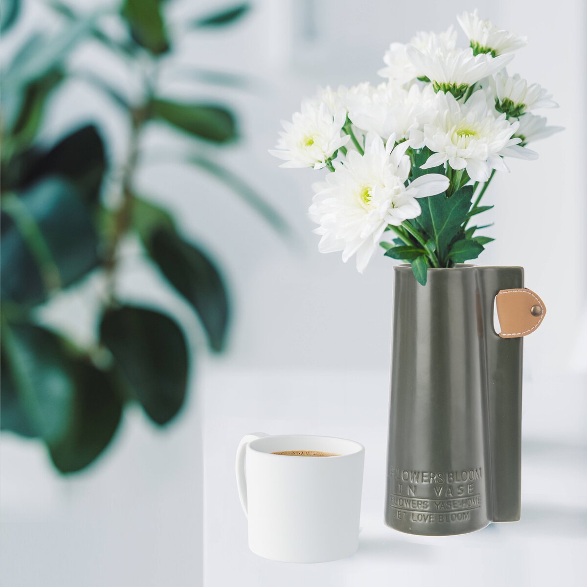 Elegantní váza se zajímavě řešeným držadlem bude dokonalou ozdobou stolu, komody i police. Hladké tělo výšky 18 cm s nápisem je doplněno koženkovým detailem s kovovým nýtem, stane se tak designovou záležitostí.