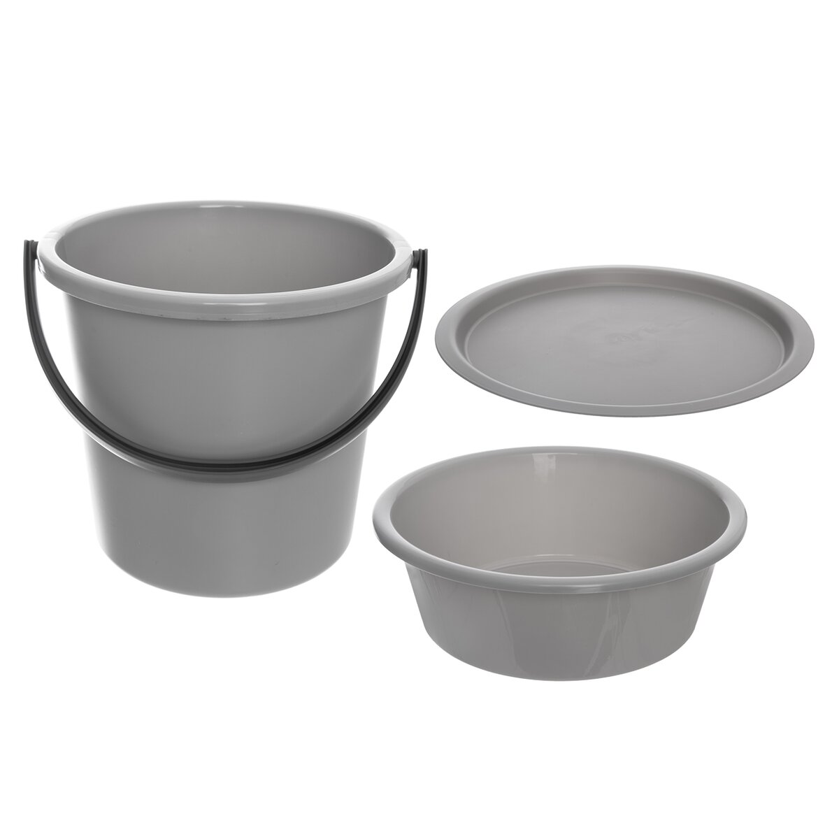 Šedé vědro je základním pomocníkem při mytí podlah i při nejrůznějším úklidu a přenášení drobností v domácnosti, na chalupě nebo v provozovně. Je doplněno v sadě praktickým dřezem o objemu 5 l a kryto víkem. Víko má rovnou plochu, takže na něj lze pokládat další věci, což se může hodit i při uložení celého setu.