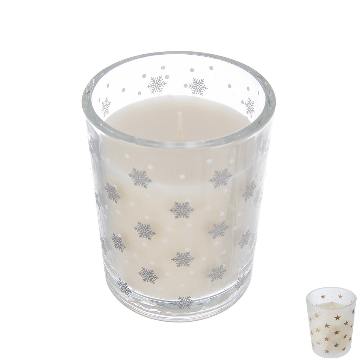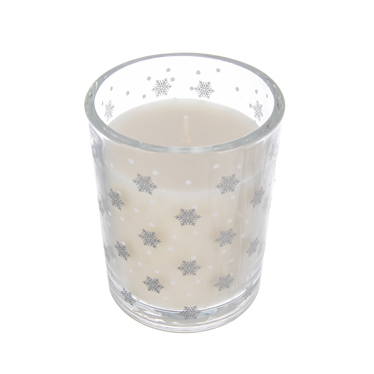 Svíčka z vosku má bavlněný knot a je vsazena do skleněného obalu, zdobeného dekorem sněhových vloček.