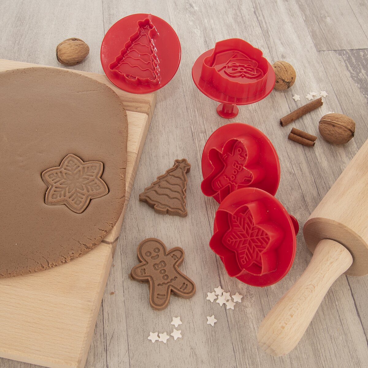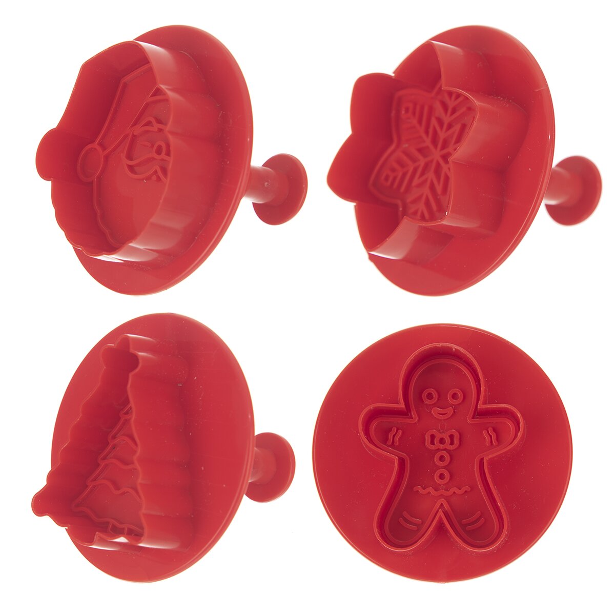 Kód produktu 127456Sada 4 kusů vánočních plastových vykrajovaček s pístem má na spodní straně razítko s reliéfem, který se otiskne do vyváleného těsta.