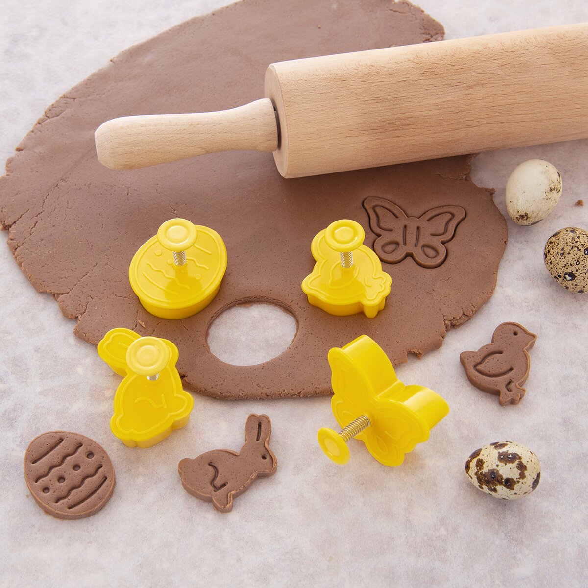 Kód produktu 127453Sada 4 kusů plastových vykrajovaček, opatřených pístem s plochou, která otiskne velikonoční reliéf do vyváleného těsta.