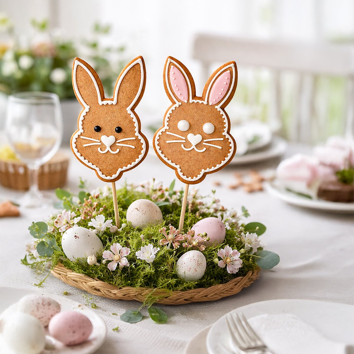 Veselá hlava zajíčka nesmí na oslavě svátků jara chybět. Vykrojte perníčky, vsuňte do spodní části špejli a dejte péct. Po nazdobení bílkovou polevou můžete tyto "ušáky" zapíchnout do mazance nebo hezké velikonoční vazby. Nebo zajíčka přidejte do ošatky mezi ostatní perníčky a kraslice.