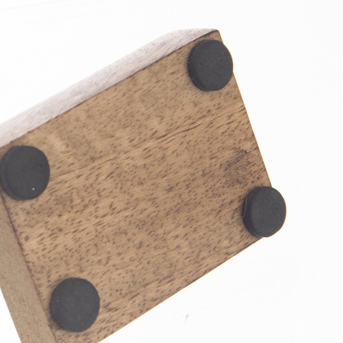 Hodí se i jako milý dárek. Kov s černým povrchem je doplněn podstavcem z mangového dřeva, který má gumové podložky, takže nedojde k poškrábání nábytku, komody či stolu.