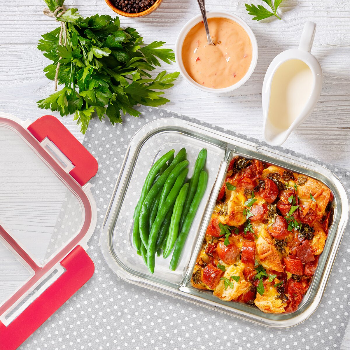 A navíc si jej můžete v misce uzavřené plastovým víčkem s praktickými klipy a silikonovým těsněním odnést do práce, aniž by vám pokrm nevytekl se nepřelil do druhé části. Stačí jen důkladně víčko nasadit na misku a silou zacvaknout klipy z PP plastu dolů. Vychutnejte si třeba zapečené brambory se salátem nebo lasagne s osvěžujícím tzatziki.