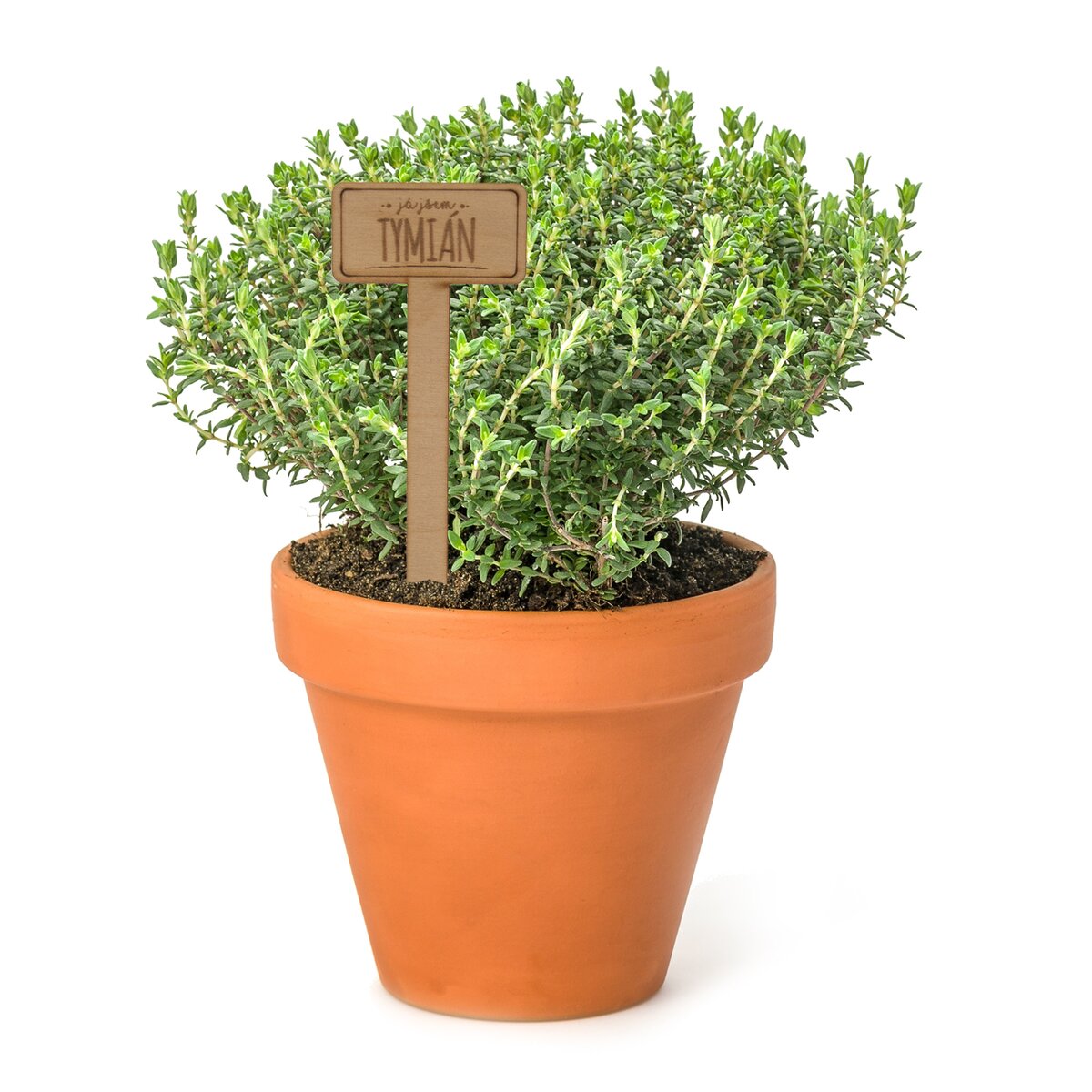Po vysetí semínek bazalky si květináč nebo část záhonku můžete stylově označit dřevěným zápichem s vypalovaným dekorem a nápisem TYMIÁN.