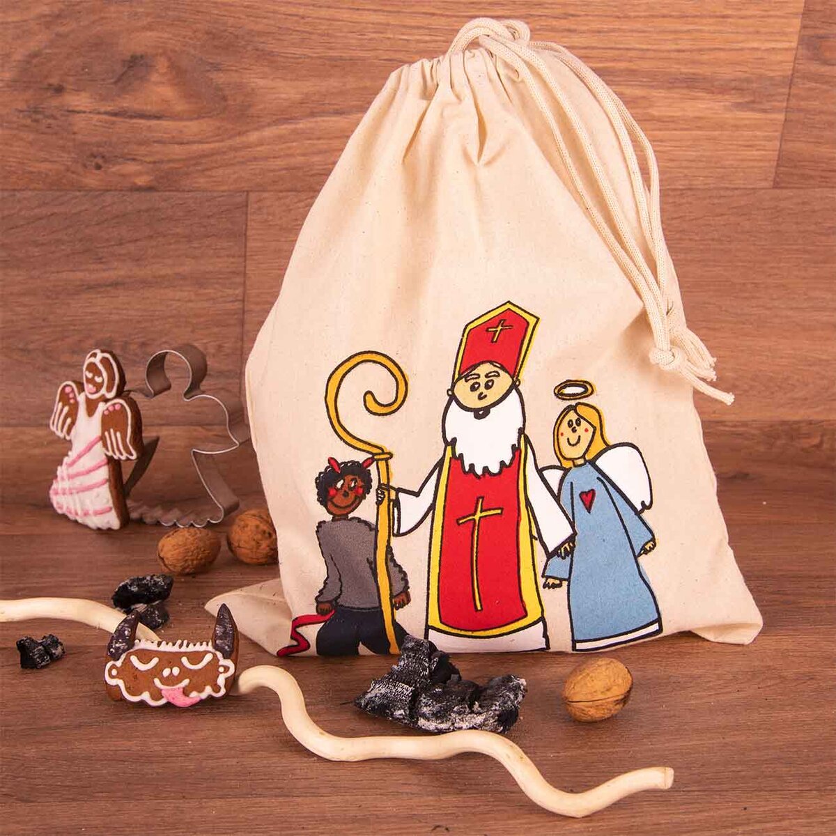 Zatahovací sáček ze 100% bavlny, s milým motivem Mikuláše, anděla a čerta. Můžete ho naplnit ovocem, dobrotami, pro zlobivé děti přidat brambory a uhlí.