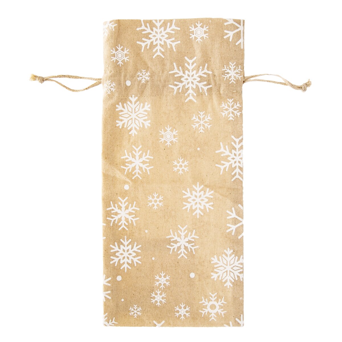 Látkový sáček s dekorem vloček je určen k uložení lahve vína nebo jiného oblíbeného alkoholu, ale i na další drobnosti nebo tzv. měkké dárky, které se špatně balí do balicího papíru. A na rozdíl od papíru jej lze používat opakovaně.
