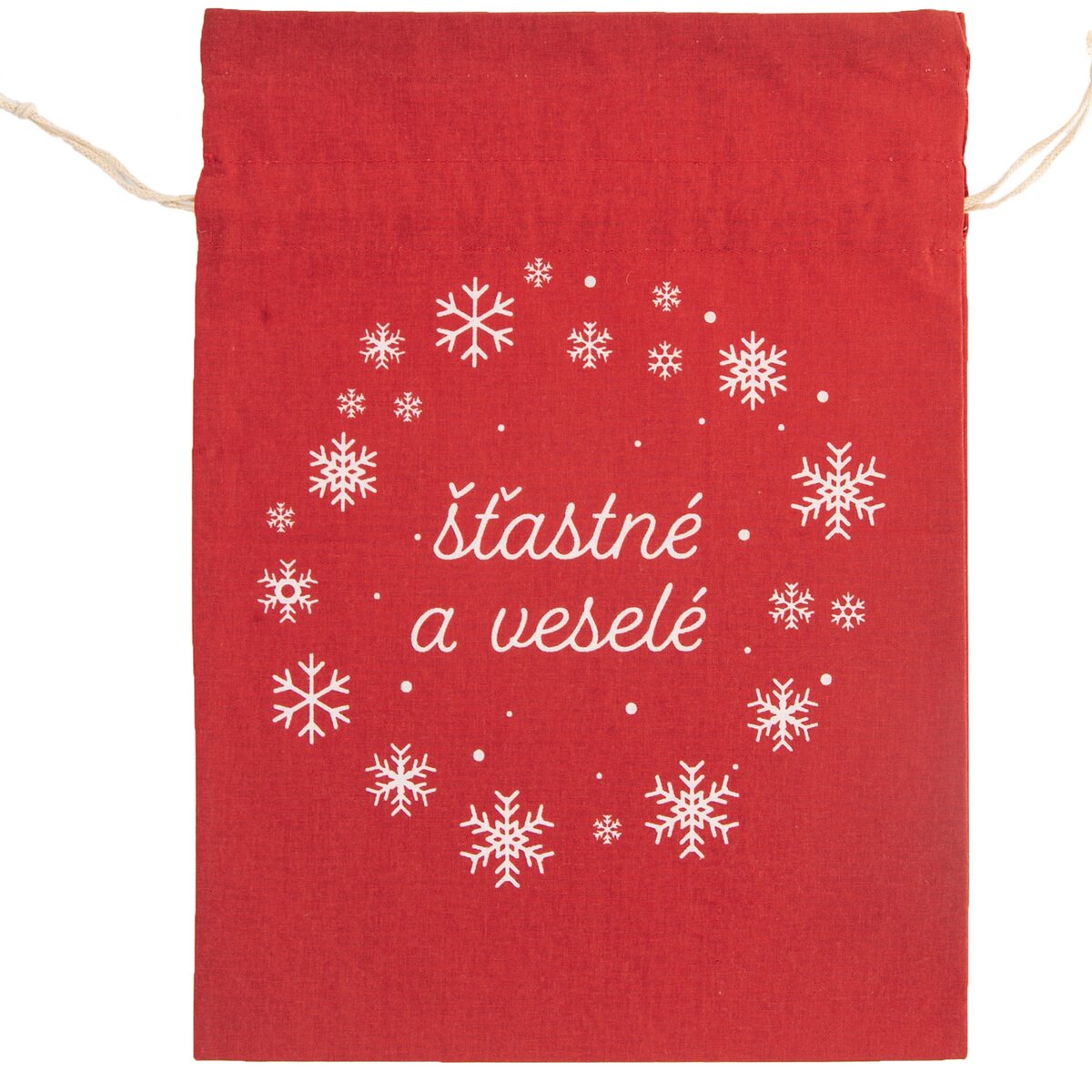 Větší červený látkový sáček s dekorem vloček a nápisem ŠŤASTNÉ A VESELÉ je určen k uložení dárků, např. originálních hrnečků, svíček, kosmetiky nebo na tzv. měkké dárky, které se špatně balí do balicího papíru. A na rozdíl od papíru jej lze používat opakovaně.