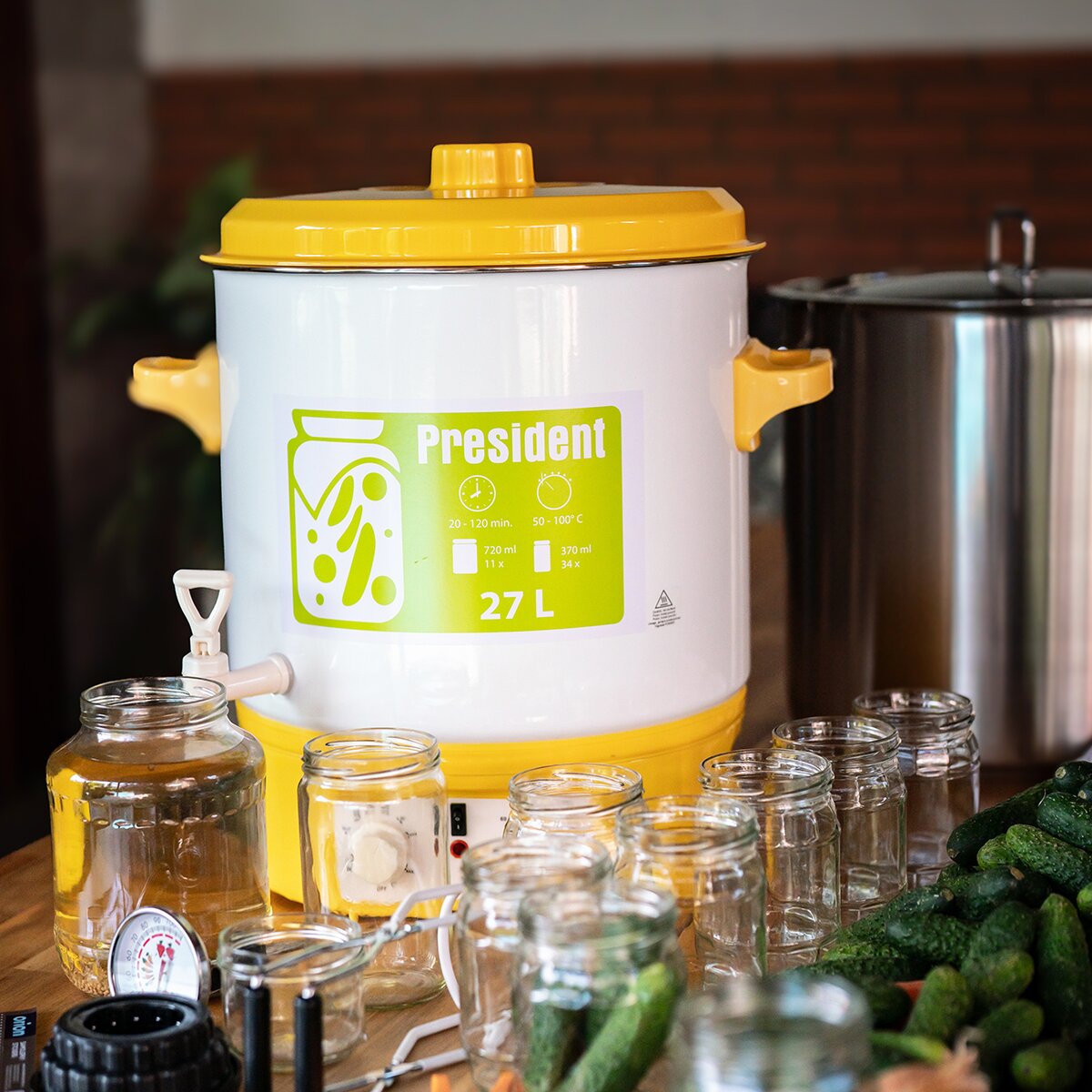 A aby bylo v čem zavařovat, přicházíme s praktickým elektrickým zavařovacím hrncem z kolekce PRESIDENT. Tento univerzální hrnec o objemu 27 litrů má smaltovaný, hygienicky nezávadný povrch a skrytý topný článek. K uzavření slouží praktické plastové víko. Díky jeho velikosti se do něho vejde větší množství sklenic, např. 11 sklenic 0,75 l nebo 34 sklenic 0,37 l.