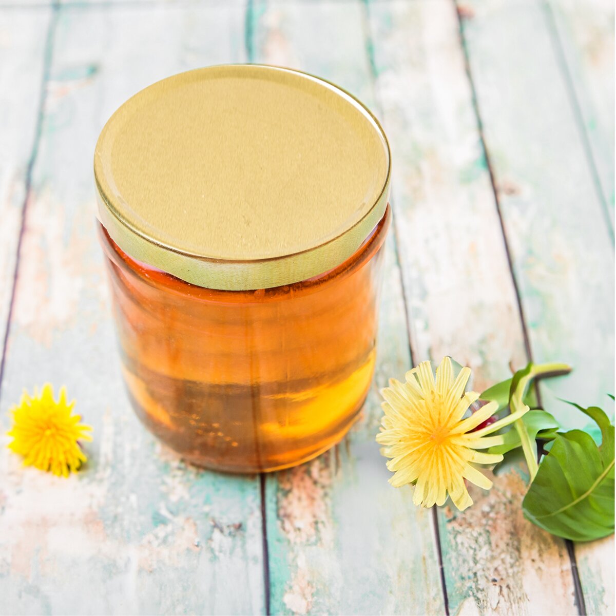 Zavařovací skleněná sklenice se závitem o objemu 0,33 l má kovové víčko ve zlaté barvě.