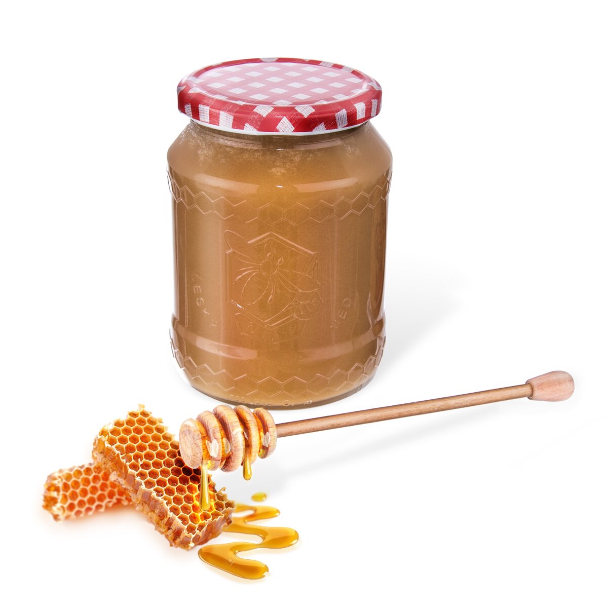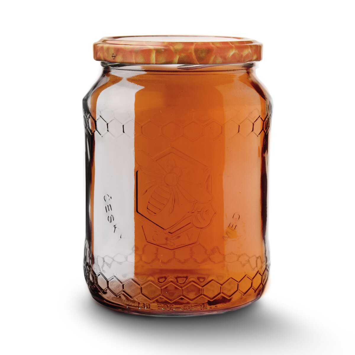 Zavařovací sklenice se stylovým reliéfem pro každého vášnivého včelaře, o objemu 0,73 l. S barevným kovovým víčkem na závit s motivek včelek a medových pláství.